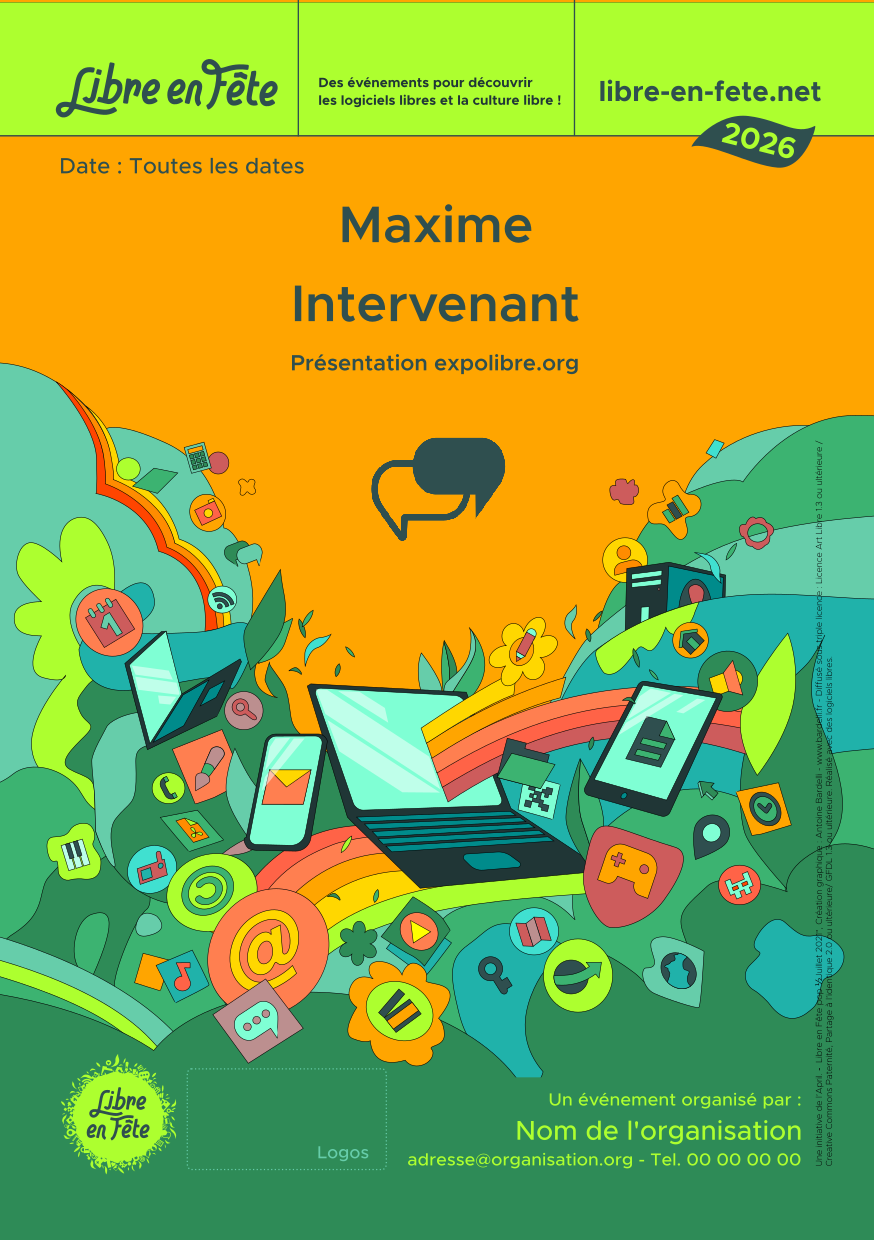 Nous vous proposons un modèle d’affiche au format source SVG que vous pouvez utiliser et personnaliser pour votre événement.