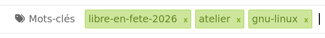 Pour que votre événement soit référencé dans le cadre du Libre en Fête, il est nécessaire d’ajouter le mot-clé libre-en-fete-2026 (sans accent), comme indiqué sur la capture ci-dessous. Vous pouvez également utiliser ce lien (le mot-clé est déjà intégré). L’événement apparaîtra alors automatiquement sur le site du Libre en Fête, sur la page Événements.